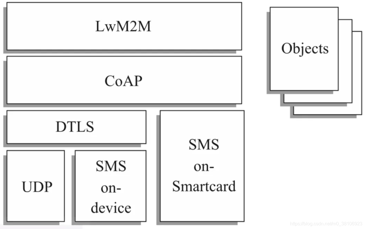 LwM2M协议底层使用CoAP协议传输数据和信令。而在LwM2M协议的架构中,CoAP协议可以运行在UDP或者SMS(短信)之上,通过DTLS(数据报传输层安全)来实现数据的安全传输。
